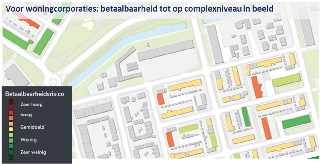 Daarnaast zijn we in staat om de financiële positie van huishoudens te berekenen, of deze nu positief of negatief is. Dit noemen we het betaalbaarheidsrisico van een huishouden. We kijken dan niet alleen naar inkomen, energiekosten en kwaliteit van de woning, maar nemen ook de woonlasten, gemeentelijke belastingen, waterkosten en kosten van participatie mee zoals vastgesteld door het Nibud. Dit is geheel in lijn met de publicaties van het Commissie Sociaal Minimum en de huidige debatten rondom bestaanszekerheid in Nederland. Voor woningcorporaties kunnen we per complex inzichtelijk maken of er sprake is van een hoog of laag betaalbaarheidsrisico, zodat hier direct op kan worden ingespeeld.