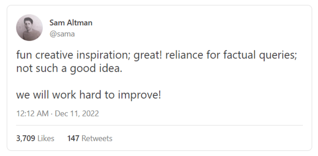 Toch is de vaakst gehoorde kritiek dat de informatie uit ChatGPT onbetrouwbaar is. ChatGPT ‘hallucineert’ zoals andere taalmodellen dat vaak ook doen. Dat komt erop neer dat het uitspraken doet die feitelijk onjuist zijn. Nu is dat geen probleem als het gaat om vanzelfsprekende onwaarheden, want deze kun je vervolens zelf factchecken. Maar wanneer het hele ingewikkelde materie betreft is dat een stuk lastiger. Daarom wijzen experts erop dat je in ieder geval nog niet volledig kunt vertrouwen op de uitspraken van ChatGPT. Sam Altman, de CEO van het bedrijf achter ChatGPT, geeft ook zelf aan dat je het nog niet moet gebruiken voor hele inhoudelijke vragen: