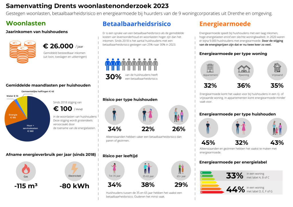 Net als in 2018 wilden de negen woningcorporaties van Drenthe (Actium, De Volmacht, Domesta, Lefier, Eelder Woningbouw, Wetland Wonen, Woonborg, Woonconcept en Woonservice) een gezamenlijke inkijk in hoeverre hun huurders rondkwamen. Uit onze bevindingen, gebaseerd op gedetailleerde microdata van het Centraal Bureau voor Statistiek, blijkt dat de totale woonlasten voor huurders sinds 2018 gemiddeld met €100 per maand zijn gestegen, voornamelijk door de stijgende energiekosten, inflatie en lage inkomens.